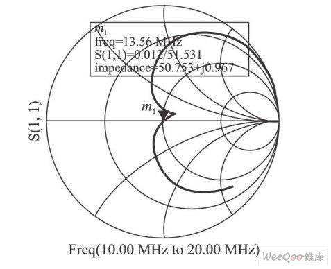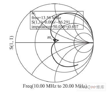 手動調(diào)諧即是交替不斷調(diào)整電容C1、C2 的值,同時觀察曲線變化,直到在所要求的頻率點(diǎn)S11等于0。圖2為某一天線電路在頻率在10~20MHz之間變化時,其反射系數(shù)的變化曲線,其中,標(biāo)記13. 56MHz的點(diǎn), S11值近似為0,達(dá)到了匹配要求。