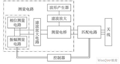 手工匹配采用的是阻抗分析儀或者網(wǎng)絡(luò)分析儀,網(wǎng)絡(luò)分析儀是用定向耦合器來測量天線電路的反射系數(shù)。但使用定向耦合器有幾個主要的缺點(diǎn),例如功率損耗大和很難嵌入到IC芯片。故而本文在電路中不使用耦合器,從圖3看出,測量電路包含以下4部分。
