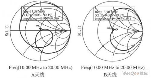 結(jié)果如圖7所示,對于A, B兩種天線的任何一種,都找到了最優(yōu)C1 和C2 的組合。當(dāng)頻率為13. 56MHz時,兩類天線的反射系數(shù)雖然與0點(diǎn)都有一定的偏差,但其偏差都在可接受范圍之內(nèi)。