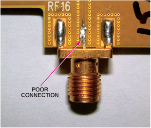 其次需要考慮PCB的裝配連接器與PCB傳輸線路之間的結點至關重要,因此連接器的焊接會對過渡產生重大影響。連接不良或未對齊的連接器會破壞電感和電容之間的微妙平衡,從而影響結點的阻抗。圖5是一個焊接不良的連接器結點示例。