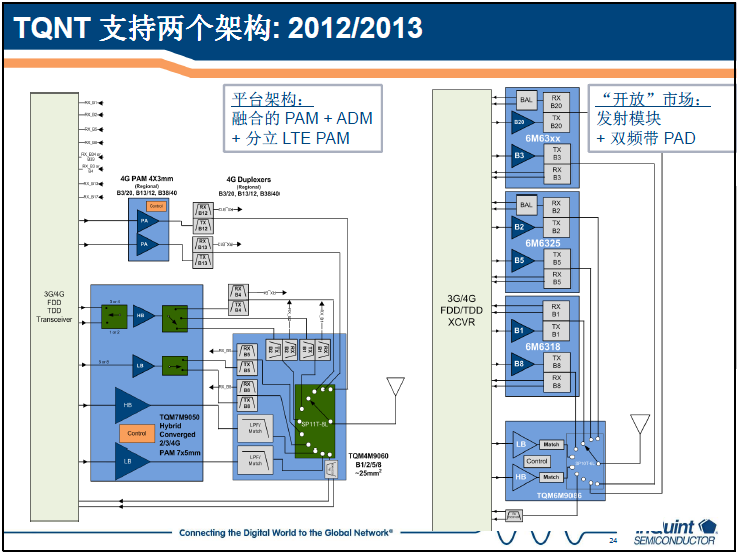 對于多頻多模的3G/4G手機,針對射頻前端器件的設計如何實現集成?熊挺表示,目前有兩種方案:一種是融合架構,將不同頻率的射頻功率放大器PA集成;另一種架構則是沿信號鏈路的集成,即將PA與雙工器集成。兩種方案各有優缺點,適用于不同的手機。融合架構,PA的集成度高,對于3個以上頻帶巨有明顯的尺寸優勢,5-7個頻帶時還巨有明顯的成本優勢。缺點是雖然PA集成了,但是雙工器仍是相當復雜,并且PA集成時有開關損耗,性能會受影響。而對于后一種架構,性能更好,功放與雙功器集成可以提升電流特性。所以TriQuint可以提供兩種架構的方案,大于6個頻段時(指3G和4G)采用融合架構,而小于四個頻段時采用PA與雙工器集成的方案PAD。
