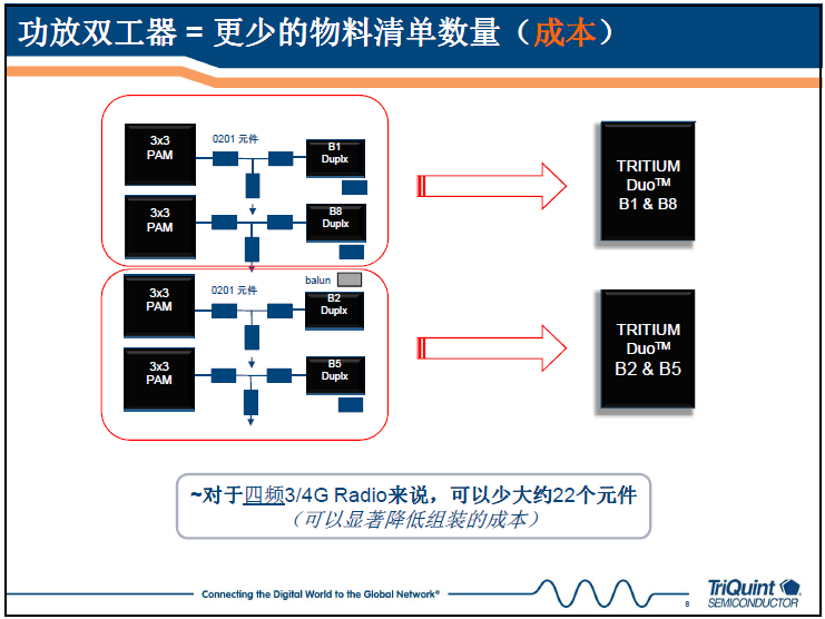 TRITIUM DUO™為每個頻帶都做了優化,因此與可配置的放大器不同,它在放大完成后不需要切換,從而實現一個更高性能,更高效的射頻解決方案。而且TriQuint領先的無源器件可多模式操作,符合3G和4G標準,一個采用TRITIUM DUO™的4頻帶解決方案可有效降低物料清單成本,提升制造和供應鏈效率。