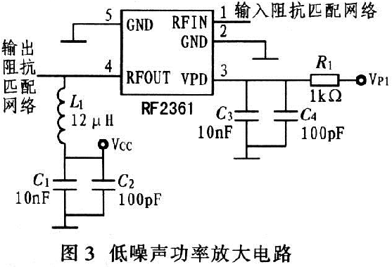 以低噪聲功率放大器RF2361為核心設計的低噪聲功率放大電路,如圖3所示,其VPD引腳上的并聯電容器實現電源VPD的濾波,RFOUT引腳上的電感電容串并聯網絡可對電源VCC濾波。