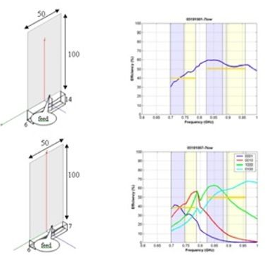 圖3:在700MHz至960MHz范圍內(nèi),a)多頻段天線 和 b)調(diào)諧天線的體積和輻射效率的比較(天線尺寸單位:mm)。