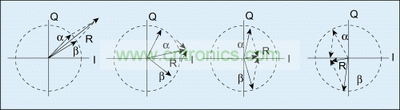 圖1用矢量圖顯示了兩個(gè)電壓恒定、相位不同的信號(hào)α與β如何合并起來形成一個(gè)任意電壓信號(hào)R,圖2是采用異相技術(shù)的功率放大器結(jié)構(gòu)示意。
