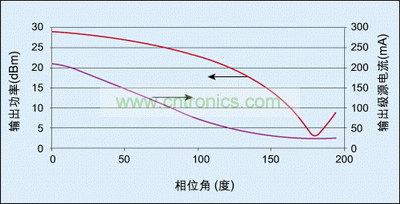 圖3顯示了輸出功率和輸出級(jí)源電流與放大器驅(qū)動(dòng)信號(hào)相位角之間的關(guān)系,該圖數(shù)據(jù)得自于一個(gè)運(yùn)行在5.25GHz、Vdd為5V的放大器。請(qǐng)記住,放大器已進(jìn)入深度飽和,因而工作在恒定的電壓振幅下,但要注意源電流與異相角有很大的關(guān)系。這說明每個(gè)放大器的阻抗(往合并器方向看)在低輸出功率時(shí)確實(shí)增大,而源電流在下降。