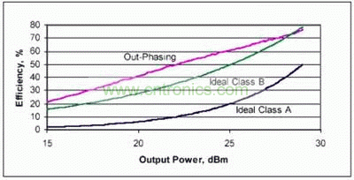 圖4可看出源電流下降的確切數(shù)量,圖中顯示了在不同輸出功率下測得的異相功率放大器的效率,它還顯示了理想B類和理想A類放大器的最大理論效率,實(shí)際的AB類放大器將在理想A類和理想B類曲線之間。注意,實(shí)際異相功率放大器測得的效率要優(yōu)于理論上完美的B類放大器。在全功率下,放大器完全工作在同相狀態(tài),可觀察到80%的效率。隨著進(jìn)入放大器的信號(hào)相位減小,輸出功率也在下降,但是與典型的AB類放大器相比,效率下降要慢得多。在峰值以下7.8dB功率處(這是802.11a信號(hào)典型峰值-均值比率),放大器的效率為46%。