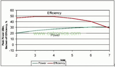 驅(qū)動(dòng)級(jí)對(duì)總體功耗也有貢獻(xiàn)。包括驅(qū)動(dòng)級(jí)在內(nèi)的功率添加效率(PAE)在7.8dB后退點(diǎn)處大于33%,此后退效率可以在廣泛的電源中實(shí)現(xiàn)。圖5顯示了各種電源電壓下放大器后退7.8dB時(shí)的效率,注意,確實(shí)有兩種方式控制放大器的瞬時(shí)輸出功率,即異相和改變電源電壓。電源電壓通常用于緩慢改變平均輸出功率,相位角用于快速改變信號(hào)的瞬時(shí)包絡(luò)線。
