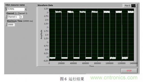 在程序框圖中,先初始化示波器,并啟動示波器的AutoSetup 功能,然后循環獲取示波器的數據,并送顯示,直到用戶中止或者獲取數據過程中出現錯誤。最后可以在前面板啟動運行,結果如圖6所示。