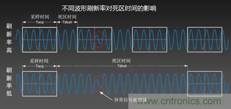 由此可知,死區(qū)時間的大小將影響捕獲周期的長短進(jìn)而影響波形刷新率的高低。如下圖所示: