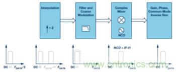 像在DDC中一樣,2倍插值和濾波器被合并為一個模塊。然后重復此功能模塊并級聯三到四級,以提高靈活性。也可使用2倍之外的其他插值系數以提供更大的靈活性,尤其是在RF DAC中。