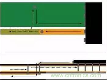 圖1:信號(hào)電流從器件引腳經(jīng)過(guò)通孔流到較低層。