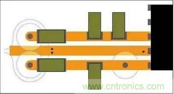 每個(gè)這些通孔都會(huì)在內(nèi)接地層上產(chǎn)生大于通孔直徑自身的禁入?yún)^(qū),提供制造空隙。這些禁入?yún)^(qū)很容易在回流路徑上造成中斷。一些通孔彼此靠近則會(huì)形成接地層溝,頂層CAD視圖看不見,這將導(dǎo)致情況進(jìn)一步復(fù)雜化。圖2兩個(gè)電源層通孔的接地層空隙可產(chǎn)生重疊的禁入?yún)^(qū),并在返回路徑上造成中斷。回流只能轉(zhuǎn)道繞過(guò)接地層禁入?yún)^(qū),形成現(xiàn)在常見的發(fā)射感應(yīng)路徑問(wèn)題。