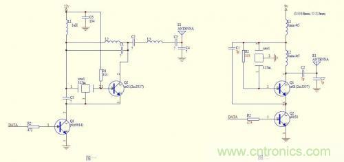 兩電路基本原理一致,都是由0、1信號控制實現高頻脈沖發射的電路,工作頻率由晶振決定,從穩定性上分不出優劣。圖二電路簡潔,稍容易調試些,圖一在三極管集電極與電源間加了選頻網絡,在三極管集電極與天線之間也加了選頻網絡,輸出頻率更純凈,但調試要麻煩些。再一點區別是圖二上方三極管的基極通過電阻引入了交流負反饋,其實這對該電路穩定性的影響也并不明顯。電源上對地的高頻電容還是保留為好,但圖二中沒有畫出。