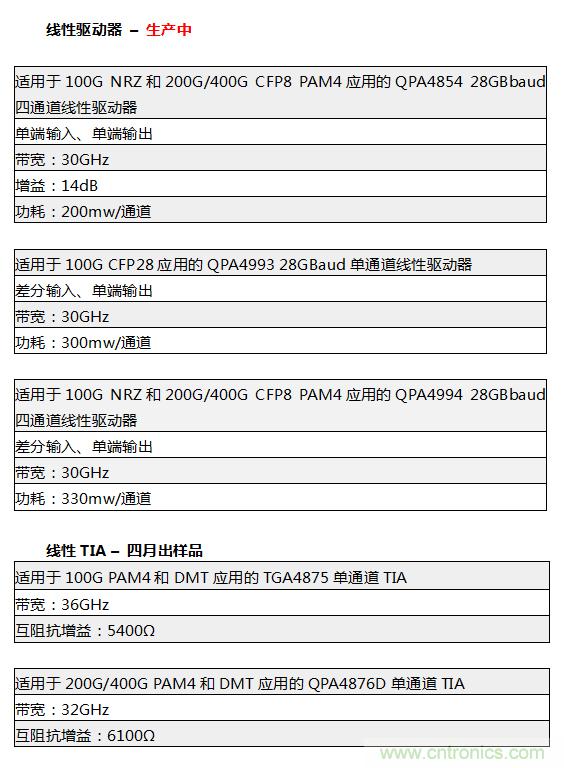 LightCounting Market Research公司創始人兼CEO Vladimir Kozlov說道:“雖然目前大型數據中心普遍采用100G以太網,但人們對于實施新的以太網速度,尤其是采用PAM4調制,仍有很大的興趣。Qorvo的全新線性驅動器和互阻抗放大器(TIA)將支持所有新速度,包括25G、50G、200G甚至400G。”