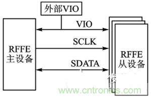 RFFE是MIPI聯盟針對射頻前端設備所提出的控制規(guī)范。單個總線上可以掛載1個主機,同時最多掛載15個從機。該總線使用2條信號線,一條是主機控制的時鐘線SCLK,另一條是雙向數據線SDATA,此外還有一條參考電壓線VIO。VIO可由主機提供,也可由外部提供。SCLK的標準頻率是32kHz-26MHz,擴展頻率是26MHz-52MHz,在空閑時SCLK和SDATA保持低電平。