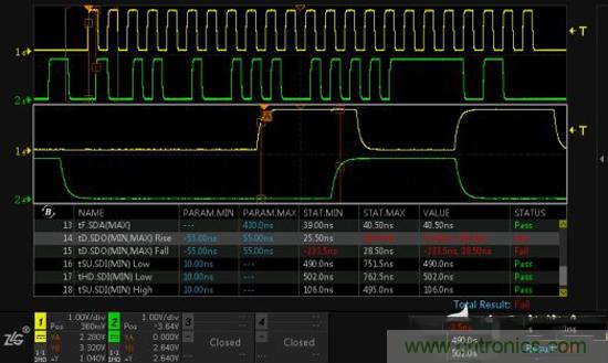 ZDS4000同時具備強大的時序分析功能,在Analyze中使能MIPI-RFFE時序分析,依靠我們具有的完整測試項目,可迅速找出時序中可能存在的問題與風險。如圖5發(fā)現的數據有效時間測試不通過,只需選中該項后輕輕一按B旋鈕,就可立即定位到測試不通過所在的位置。
