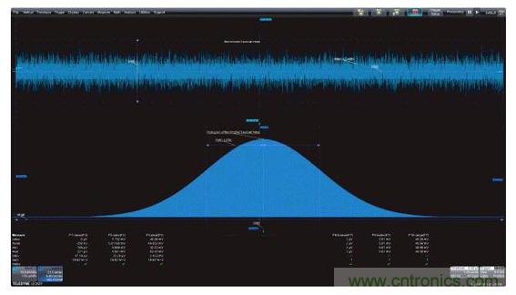 圖1:左上圖是帶寬受限的高斯噪聲的時域圖,左下圖是功率譜密度,是帶寬受限噪聲的頻域圖;右面的柱狀圖是帶寬受限噪聲的統計圖。這三個視圖都因采用了有助于對測量進行量化的測量參數而得到增強。