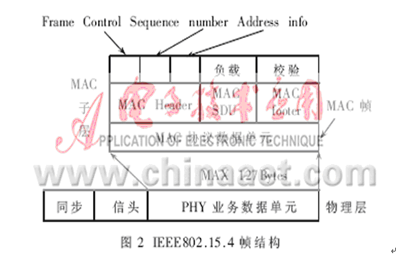 IEEE802.15.4的MAC協議包括以下功能:設備間無線鏈路的建立、維護和結束;確認模式的幀傳送與接收;信道接入控制;幀校驗;預留時隙管理;廣播信息管理。MAC子層提供兩個服務與高層聯系,即通過兩個服務訪問點(SAP)訪問高層。通過MAC通用部分子層SAP(MCPS-SAP)訪問MAC數據服務,用MAC層管理實體SAP(MLME-SAP)訪問MAC管理服務。這兩個服務為網絡層和物理層提供了一個接口。靈活的MAC幀結構適應了不同的應用及網絡拓撲的需要,同時也保證了協議的簡潔。MAC幀的通用格式如圖2所示。