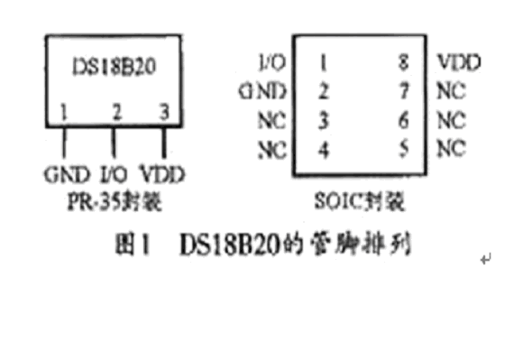 DS18B20采用3腳PR-35封裝或8腳SOIC封裝,其管腳排列如圖1所示。圖中,GND為地;I/O為數(shù)據(jù)輸入/輸出端(即單線總線),該腳為漏極開路輸出,常態(tài)下呈高電平;VDD是外部+5 V電源端,不用時應(yīng)接地。