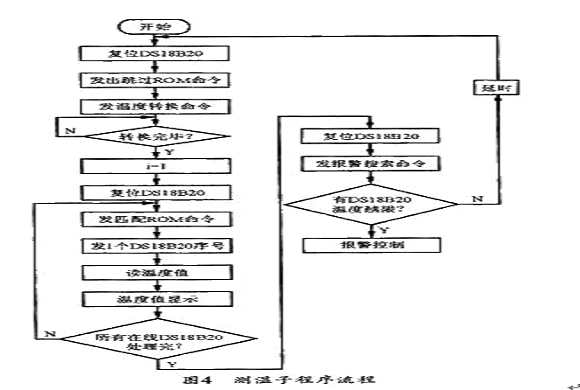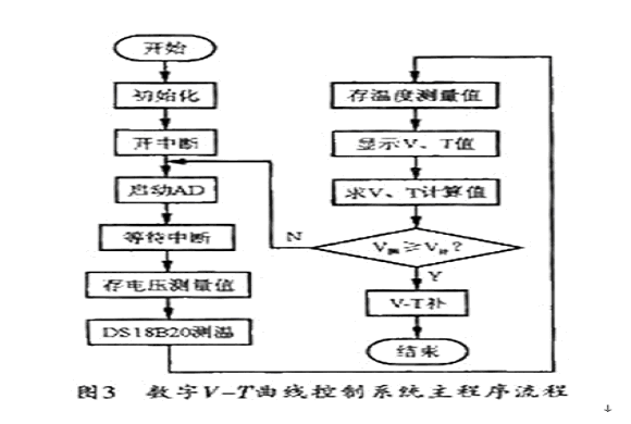 本系統(tǒng)程序主要包括主程序、讀出溫度子程序、溫度轉(zhuǎn)換命令子程序、計算溫度子程序、顯示數(shù)據(jù)刷新子程序等。編程時必須嚴(yán)格按照DS18B20的時序規(guī)定進行。尤其需要注意的是,在多點溫度測量中,由于多個DS18B20掛在一條總線上,為識別不同的器件,在系統(tǒng)安裝之前,應(yīng)將主機逐個與DS18B20掛接,以讀出其序列號。具體是由主機先給DS18B20發(fā)一個復(fù)位脈沖,在DS18B20發(fā)回響應(yīng)脈沖給主機后,主機再發(fā)讀ROM命令(代碼33H),并發(fā)一個15μs左右的脈沖,接著再讀取DS18B20序列號的一位,并用同樣方法讀取序列號的每一位。其V-T曲線控制系統(tǒng)主程序和測溫子程序分別如圖3和圖4所示。