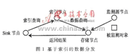(4)基于索引的數(shù)據(jù)分發(fā)方案(index-based data dissemination scheme)[3],這種方案克服了以上幾種方案存在的問題。在這種方案中,負責(zé)監(jiān)測某對象的源節(jié)點定期產(chǎn)生該監(jiān)測對象的感知數(shù)據(jù),并存儲到存儲節(jié)點上,存儲節(jié)點可能是該源節(jié)點,也可能是鄰近的某個節(jié)點。同時,存儲節(jié)點的位置信息(稱為索引),要增加到索引節(jié)點上。當sink節(jié)點想查詢某個被監(jiān)測對象產(chǎn)生的感知數(shù)據(jù)時,就發(fā)送一條查詢消息給有關(guān)的索引節(jié)點,索引節(jié)點收到該消息后轉(zhuǎn)發(fā)查詢請求給相應(yīng)的存儲節(jié)點,由存儲節(jié)點直接發(fā)送查詢結(jié)果給sink節(jié)點。其基本思想如圖1所示。這種數(shù)據(jù)分發(fā)方案避免了發(fā)送不需要的感知數(shù)據(jù),也不需要把控制信息泛洪到整個網(wǎng)絡(luò),改善了整個系統(tǒng)的性能,但是增加了維護索引節(jié)點的額外費用。