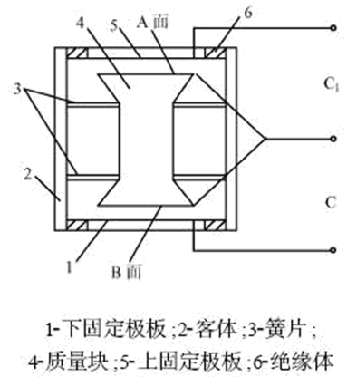 電容式加速度傳感器的原理結構如圖1所示,由圖可見,它實際上是變極距差動電容式位移傳感器,配接“m-k-c”系統構成的。質量塊4由兩根彈簧片3支撐于殼體2內,質量塊4的A面與上固定極板5組成的電容C1,以及質量塊4的B面與下固定極板1組成的電容C2。
