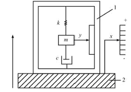 電容式加速度傳感器的等效原理圖如圖2所示。圖2中,右側標尺表示與大地保持相對靜止的運動參考點,稱為靜基準,x表示被測振動體2及傳感器底座1相對于該參考點的位移,稱為絕對位移,y 表示質量塊m 相對于傳感器底座1的位移,稱為相對位移。x和y 之間關系可用典型二階比常系數微分方程描述: