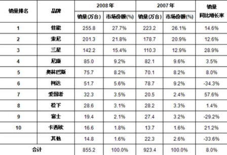 而美國品牌柯達的市場地位進一步下滑。國內品牌愛國者則通過其價格優勢、品牌宣傳和一些行業市場的地位,從2007年銷量市場第9名的位置,迅速提升到2008年市場第7名的位置,并成功超越三大日系品牌松下、卡西歐和富士。