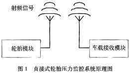 該系統的工作原理如下,把輪胎模塊裝置在輪胎內,壓力和溫度傳感器檢測輪胎內部當前的應力和溫度信息,獲得的模擬信號經過A/D變換器轉換成數字信號,然后通過射頻發射器發送出去。車載接收模塊裝置在駕駛室內,射頻接收器接收來自輪胎模塊的應力和溫度信息,當輪胎壓力過高或者過低時,通過顯示和報警裝置發出報警信息。