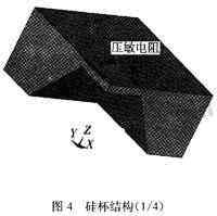 其中,壓阻式壓力傳感器主要是利用半導體的壓阻效應,把一個惠斯通電橋做在一個硅杯上,如圖4所示。當硅杯受到壓力后發生形變,惠斯通電橋的四個橋臂電阻就會發生變化,打破了電平衡,從而會有一個電信號的輸出。