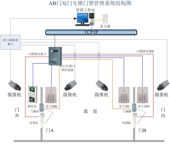 首先解釋一下AB門雙門互鎖的概念,所謂雙門互鎖聯動是指AB兩道門具有互鎖聯動的功能,即當一道門被打開時,另一道門將打不開,只有當兩道門都關上時,才能打開其中的任一道門。在高安全場所通道門禁應用中,特定人員進入第一道門后必須要按照操作要求鎖好第一道門才能進入第二道門,如進入第一道門后沒按要求關好此道門,將不能進入第二道門,這樣做的目的是為了防止犯罪分子尾隨作案。