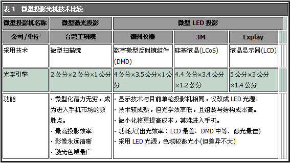 由于便攜式裝置內(nèi)建微型投影機(jī)風(fēng)潮興起,市場(chǎng)對(duì)于微型投影機(jī)的尺寸要求更加嚴(yán)苛。有業(yè)內(nèi)人士表示,相比發(fā)光二極管(LED)光源微型投影技術(shù)(表1),激光微型投影具有無(wú)限焦距、光機(jī)體積小、色彩飽和度高、低耗能等特性,后勢(shì)深具潛力。