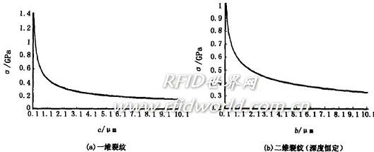 對(duì)于碎裂面垂直于芯片表面,深a、長(zhǎng)2b的二維半橢圓型裂紋而言,則滿足Ccr=[(Φ2KIC2)/(1。2πσIC2)][2],其中Ccr=(acrbcr)1/2,acr為臨界裂紋深度,bcr為臨界裂紋半長(zhǎng);裂紋幾何因子Φ=(1。2π)1/2/Y。設(shè)裂紋長(zhǎng)為2b,深度恒定為1μm,代入斷裂韌度KIC=0。82MPa,Y=1。42得,平面應(yīng)力狀態(tài)常載荷條件下碎裂的臨界強(qiáng)度σ=0。58/4b(GPa)可見,芯片碎裂臨界強(qiáng)度隨著微裂紋長(zhǎng)度的增大而急劇降低,當(dāng)裂紋大于1μm時(shí),下降趨勢(shì)逐漸平緩,并趨于穩(wěn)定小值。