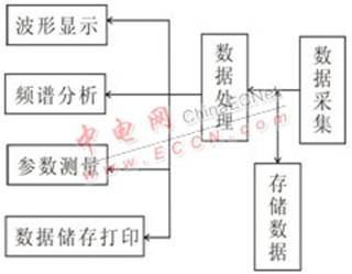 本虛擬軟件將有關(guān)測(cè)試功能集成在一個(gè)面板上,這里著重介紹LabVIEW的框圖程序設(shè)計(jì)。框圖程序是虛擬儀器的核心部分,虛擬示波器儀器主要由它來(lái)完成數(shù)據(jù)的采集、處理和顯示。本系統(tǒng)框圖程序主要包括數(shù)據(jù)采集、波形顯示、參數(shù)測(cè)量、頻譜分析和波形存儲(chǔ)及回放等5大功能模塊,如圖3示。