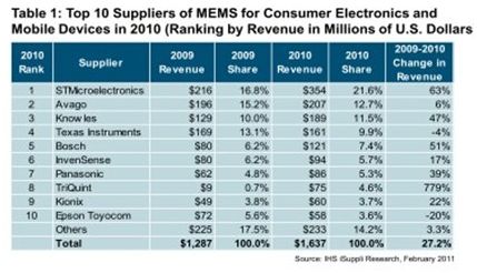 據IHS iSuppli公司的研究,利用在蘋果iPhone 4和iPad中的設計訂單,半導體供應商TriQuint和意法半導體在全球消費電子與手機微機電系統(MEMS)市場取得突出的增長。