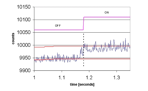 通過(guò)一個(gè)終端仿真程序,在主PC上獲得差分計(jì)數(shù),然后借助電子制表軟件加以繪制。將手指放置在10mm厚的玻璃覆蓋層上,并持續(xù)3秒的時(shí)間。按鍵的開(kāi)關(guān)狀態(tài)被疊加在原始計(jì)數(shù)上。按鍵在這兩種狀態(tài)之間干凈利落地轉(zhuǎn)換,即使是由于通過(guò)厚玻璃進(jìn)行檢測(cè)而使原始計(jì)數(shù)信號(hào)中具有較大的噪聲時(shí)也是如此。請(qǐng)注意手指和按鍵門(mén)限隨著基線(xiàn)的漂移而進(jìn)行周期性調(diào)整。當(dāng)檢測(cè)到手指的觸壓動(dòng)作時(shí),基線(xiàn)值將鎖定,直到手指移開(kāi)為止。