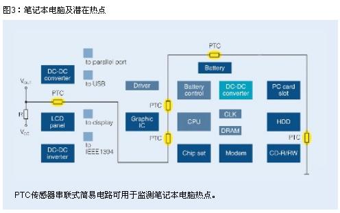 盡管當前POL具有較高效率,但仍會產生熱耗,為避免局部過熱,常需監測POL溫度,同樣也需對處理器、圖像卡芯片組、充電電池、光/磁碟機以及RAM和其它系統單元進行溫度監測。圖3所示為某筆記本電腦典型配置以及需監測的熱點。