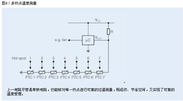 [page]PTC傳感器電阻隨溫度而發生的陡峭而迅速的變化允許單一簡易電路監測多個熱點。舉例來說,如果需要同時監測電路板上或設備中的7個不同熱點,可以選擇圖 4所示電路,在每個待測熱點處放置一個PTC。憑借其陡峭特性,所有PTC可實行串聯,仍能確保對每一處熱點進行可靠監測。