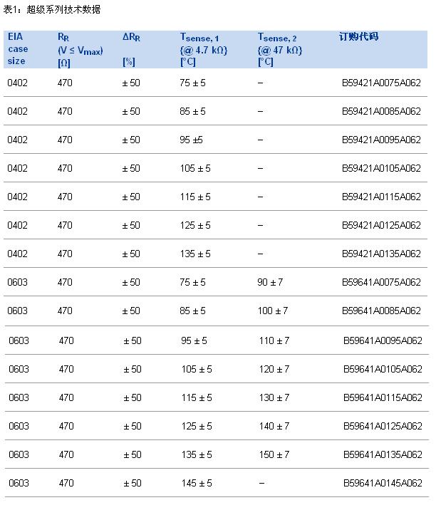 除了配置簡單可靠,該電路還有另一顯著優勢:由于超級系列PTC傳感器在75 ~ 145℃范圍均有極限溫度差別是10 K的型號,因此可針對性地使用不同參考溫度監測各熱點。表1所述為超級系列產品主要數據。