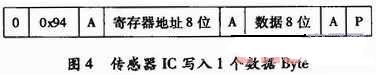 寫數(shù)據(jù)格式:圖4所示為向傳感器IC寫入1個(gè)字節(jié)數(shù)據(jù)時(shí)的正確幀格式。