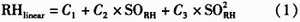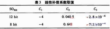 式中,RHlinear為經(jīng)過線性補(bǔ)償后的濕度值,SORH為相對濕度測量值,C1,C2和C3為線性補(bǔ)償系數(shù),取值如表3所示。