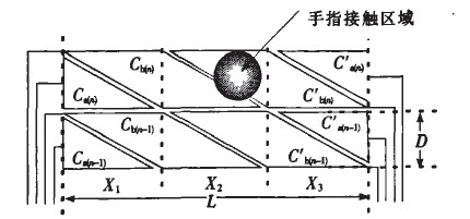 Ca(n)、Cb(n)、為第一組感應(yīng)電極,Cb(n)、Cb(n)''''為第二組感應(yīng)電極,Ca(n)''''、Cb(n)''''為第三組感應(yīng)電極,分別感應(yīng)X1、X2、X3范圍內(nèi)坐標(biāo)點(diǎn)的位置。具體坐標(biāo)計(jì)算方法與上述類似。設(shè)計(jì)中需要注意X1、X2、X3每組電極的寬度應(yīng)與手指接觸面積的寬度相當(dāng),如寬度不足則需要增加菱形電極,否則手指接觸在相同區(qū)域內(nèi)無(wú)法識(shí)別兩個(gè)感應(yīng)點(diǎn)。