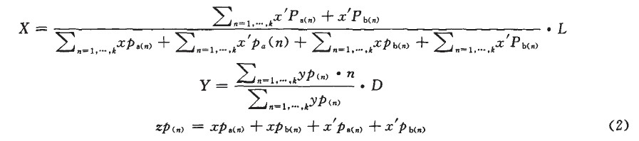 單點(diǎn)工作方式與上述坐標(biāo)計(jì)算方法相同,X坐標(biāo)的計(jì)算是通過(guò)左側(cè)兩通道的感應(yīng)值加和與右側(cè)兩通道感應(yīng)值加和的比例來(lái)計(jì)算的。y是通過(guò)同一行的左右4通道感應(yīng)值的加和與上下行的感應(yīng)值加和的比例來(lái)計(jì)算的。具體計(jì)算方法由式(2)確定: