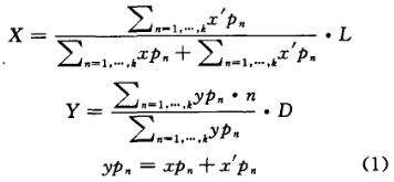 其中Cn代表第九組電極的Cp。n代表電極的組數(shù),L是電極寬,D是一組電極的高。其X坐標(biāo)的計(jì)算是通過(guò)左側(cè)通道的感應(yīng)值加和與右側(cè)通道感應(yīng)值加和的比例來(lái)計(jì)算的。y是通過(guò)同一行的左右兩通道感應(yīng)值的加和與上下行的感應(yīng)值加和的比例來(lái)計(jì)算的。具體計(jì)算方法由式(1)確定: