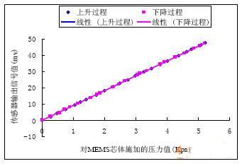 由圖可以看出,在額定工作壓力量程范圍內(nèi),芯體所受的壓差與輸出信號呈良好的線性關系,傳感器輸出信號隨壓力上升和下降過程中線性重合度非常好。多次標定結果顯示傳感器有良好的重復性,這為以后實驗數(shù)據(jù)的可靠性提供了有力保障,同時也說明所選壓阻式MEMS微型壓差敏感芯體的性能滿足實驗要求。