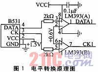 由于容柵傳感器內(nèi)部的專用控制芯片輸出的信號(hào)電壓為1.5 V,而后續(xù)數(shù)據(jù)采集系統(tǒng)工作電壓為5 V,要進(jìn)行數(shù)據(jù)交換則必須進(jìn)行電平轉(zhuǎn)換,電平轉(zhuǎn)換原理圖如圖1所示。電路中采用LM393芯片轉(zhuǎn)換電壓,LM393芯片實(shí)質(zhì)上為2個(gè)比較器,比較電壓為容柵傳感器工作電壓的一半左右,設(shè)為0.6V。通過比較電壓0.6V與CK和DATA信號(hào)線電平比較,即可將CK、DATA信號(hào)線的電壓轉(zhuǎn)換為0V或者5V。