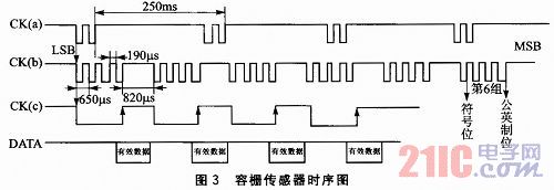 容柵傳感器時(shí)序圖如圖3所示。其中包含3個(gè)CK信號(hào)說明和1個(gè)DATA信號(hào)說明。CK(a)表示要發(fā)送的完整數(shù)據(jù)間的時(shí)序關(guān)系;CK(b)表示一個(gè)完整數(shù)據(jù)內(nèi)部各個(gè)數(shù)據(jù)組的時(shí)序關(guān)系;CK(c)和DATA表示一個(gè)數(shù)據(jù)組內(nèi)的時(shí)序關(guān)系和對(duì)采樣點(diǎn)的說明。由圖可知數(shù)據(jù)每隔250 ms發(fā)送一次,在時(shí)鐘CK的上升沿?cái)?shù)據(jù)有效。數(shù)據(jù)由LSB到MSB依次發(fā)送,總共24位二進(jìn)制數(shù)據(jù),分成6組,每組數(shù)據(jù)間隔820μs。其中前5組為數(shù)據(jù)位,第6組為控制位組(包含符號(hào)位和公英制位),控制位組的第0位的“0”表示正數(shù),“1”表示負(fù)數(shù),第3位“0”表示公制單位mm,最小單位0.01 mm,“1”表示英制單位inch,最小單位0.000 5 inch,x表示無效。為了能夠?qū)崟r(shí)采集數(shù)據(jù),采用中斷方式檢測(cè)CK信號(hào),邊沿觸發(fā)。檢測(cè)CK信號(hào)的高電平持續(xù)超過820μs時(shí),當(dāng)出現(xiàn)下降沿時(shí)觸發(fā)中斷,進(jìn)入中斷程序,再持續(xù)檢測(cè)低電平直到出現(xiàn)上升沿,讀取DATA信號(hào)電平并存儲(chǔ),總共采集24位。返回主函數(shù)根據(jù)符號(hào)位和公英制位進(jìn)行相應(yīng)處理。相關(guān)程序代碼如下: