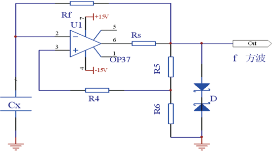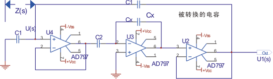 傳統的電容檢測方法有電荷轉移法和脈寬調制法,電荷轉移法常用于單電容檢測,脈寬調制法常用于差分電容檢測。圖3是方波發生器電路,產生的方波頻率。如果 Rf 為常數,則f是Cx(x)函數,可根據測定f占空比,計算出Cx(x)的值。實際上,圖3電路僅可測量靜態電容,對于測量動態電容,必須對電路進行改進, 對Cx的電荷轉移過程進行保護。改進的方法是用電容性有源網絡在電路中來代替Cx,如圖4所示。U3是電荷轉移放大器,是網絡的中心;U2是跟隨器;U4是保持器,電路靜態諧振頻率以38KHz~40KHz為好。