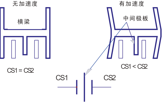 如圖5所示,中間極板(即橫梁的伸出部分)與二個固定的外極板組成差動電容 CS1和CS2。沒有加速度時,CS1=CS2;產生加速度時,橫梁的移動改變了中間極板和固定的外極板之間的相對位置,引起電容變化,CS1≠CS2。通過測量電路,將電容的變化在外加交流電壓的激勵下轉化為電學量,能夠測得該物體相應的瞬時速度或瞬時加速度值。